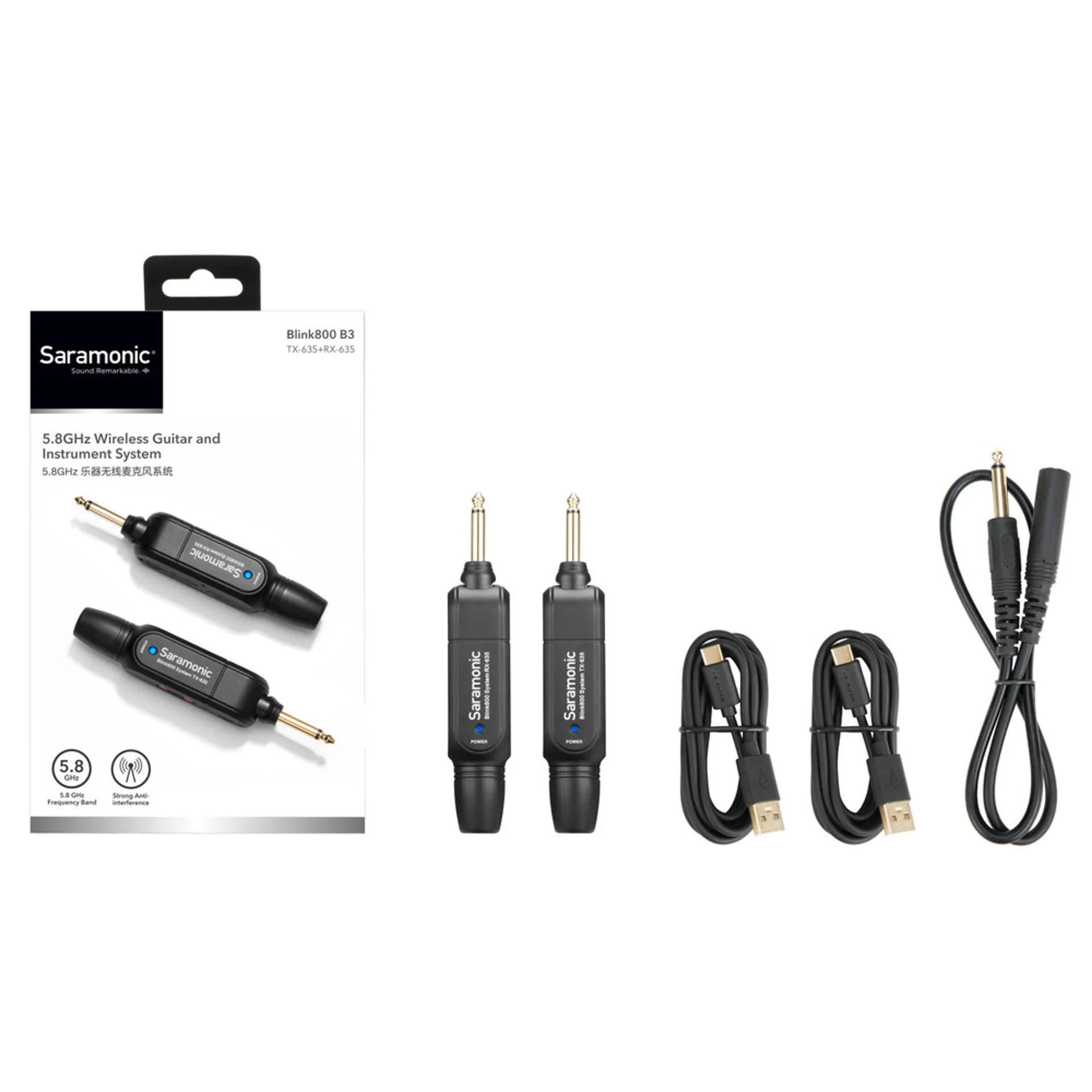 The Saramonic Blink 800 B3 is a 5.8GHz Wireless Instrument System for Guitar, Bass, Keyboard and other 1/4" Instruments and Audio Sources. It is designed to deliver a full-frequency instrument sound and performance from the instrument's 1/4" output to an amplifier, pedalboard, effects processor, or mixer. Specifically designed to capture and wirelessly transmit the instrument's natural attack and sustain that gives the instrument character and tonality. A remarkably easy-to-use solution for musicians with plug-and-play operation that allows the performer freedom to be untethered and concentrate on their performance.